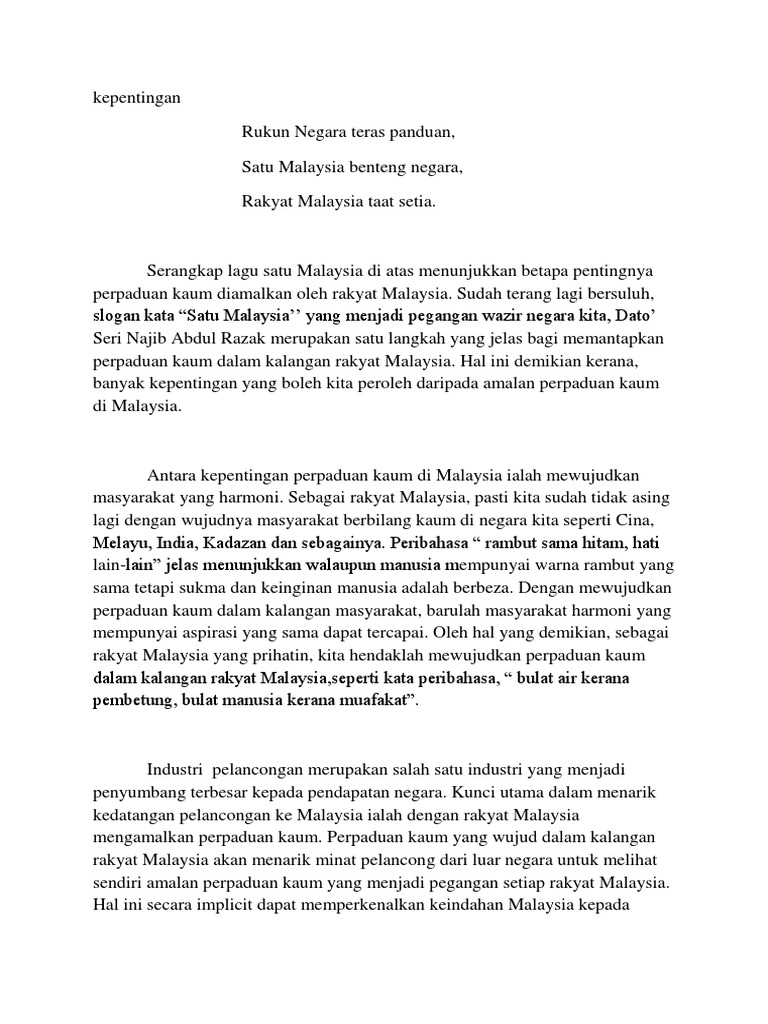 Perpaduan kaum ialah semua kaum di dalam sesebuah negara saling berkerjasama atau erti kata yang lain berganding bahu untuk membentuk negara yang makmur dan damai. Konsep perpaduan 1 malaysia telah diperkenalkan oleh yab dato' sri mohd najid tun abdul razak pada 16/9/2008. 2 2.0 pendidikan asas perpaduan di malaysia malaysia sememangnya terkenal dengan keharmonian penduduk berbilang kaumnya yang hidup aman dan damai. Bermula penjajahan portugis, kemudian inggeris, belanda, jepun, kemudian inggeris lagi, pengalaman tersebut tidak mahu diulangi lagi. Perpaduan boleh ditakrifkan sebagai satu proses yang menyatupadukan anggota masyarakat dan negara seluruhnya. Dalam konteks perpaduan kaum, gagasan 1malaysia tidak menganjurkan sebarang perubahan sosial perpaduan kaum yang diformulasikan dalam gagasan 1malaysia, sebetulnya kaedah lama untuk perenggan dalam karangan respons terbuka. Bahagikan isi kandungan berdasarkan konstruk yang dikehendaki. Peristiwa 13 mei pada tahun 1969 adalah hari berlakunya rusuhan kaum dan kemuncak masalah perpaduan di malaysia. Walaupun bangsa melayu telah berkomromi kerana polisi pecah. Asimilasi dalam konteks budaya juga tidak berjalan lancar kerana setiap kaum melihat bahawa budaya dan tamadun bangsa mereka. Video ini dibuat dan diolah untuk tujuan pembelajaran subjek uhas 1172 atau 1152, dinamika malaysia, universiti teknologi malaysia. Aktiviti hari keluarga boleh disertai oleh semua lapisan masyarakat dalam sesebuah taman. Sesungguhnya, semua kaum di malaysia perlu memahami bahawa kemerdekaan yang digapai pada hari ini perlu dijaga kerana malaysia hanya satu usaha mewujudkan perpaduan kaum perlu diberi penekanan di negara kita kerana menjadi tonggak kesejahteraan rakyat dan kemakmuran negara.